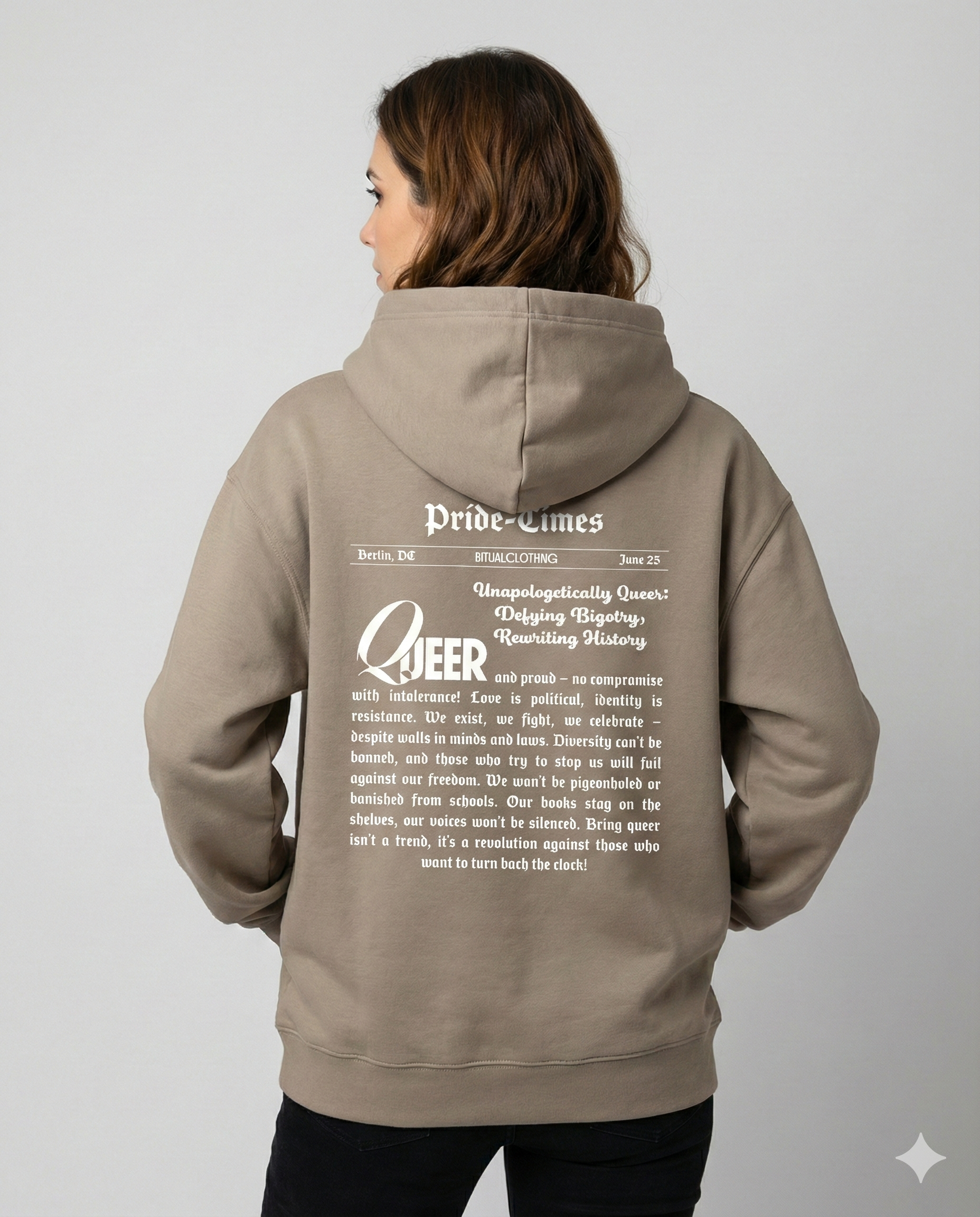 Liebes, dieser Hoodie ist ein absolutes Must-have! Egal ob beim CSD, im Café oder einfach auf der Straße – mit diesem Teil setzt du ein Statement. Das Zeitungsdesign auf dem Rücken? Ein echter Hingucker, der sofort klarmacht: Hier wird Geschichte geschrieben!